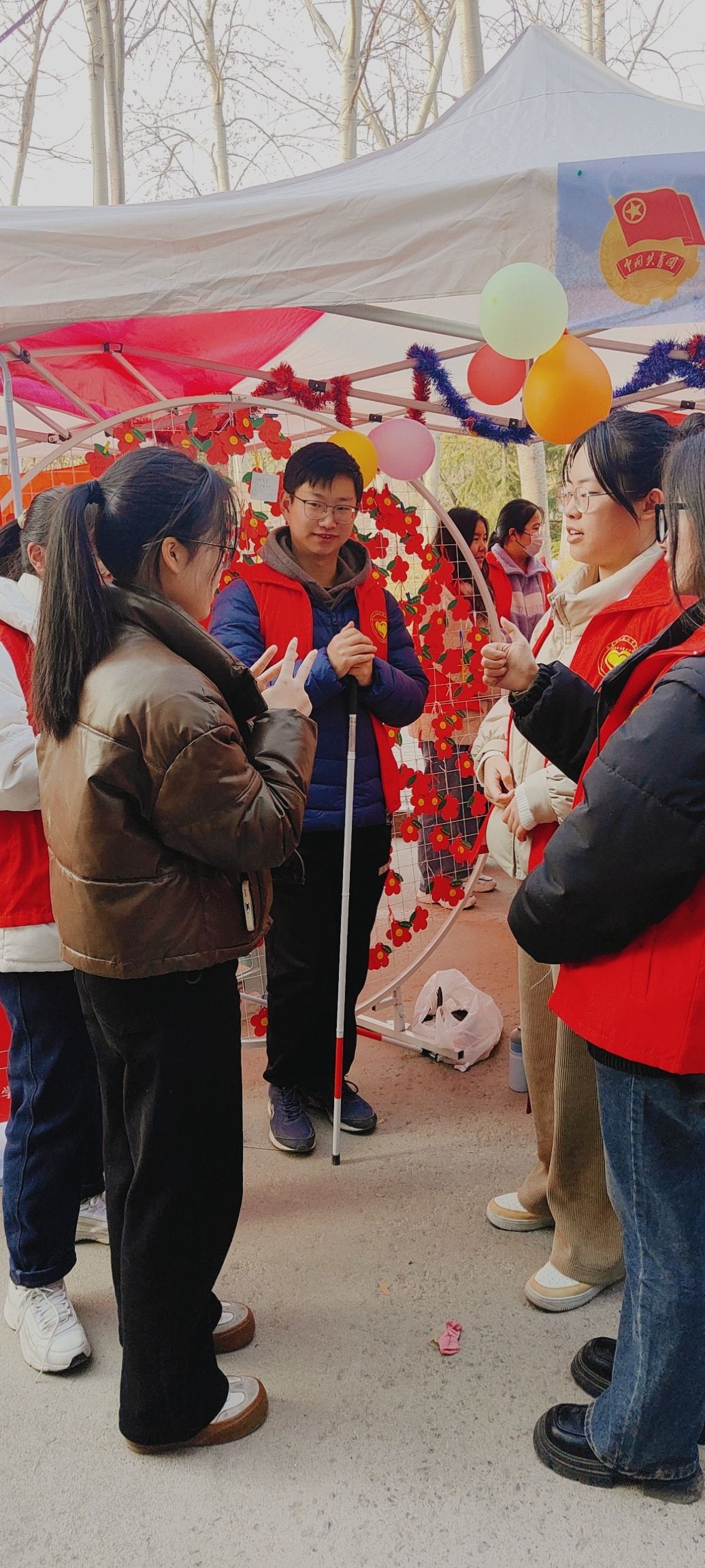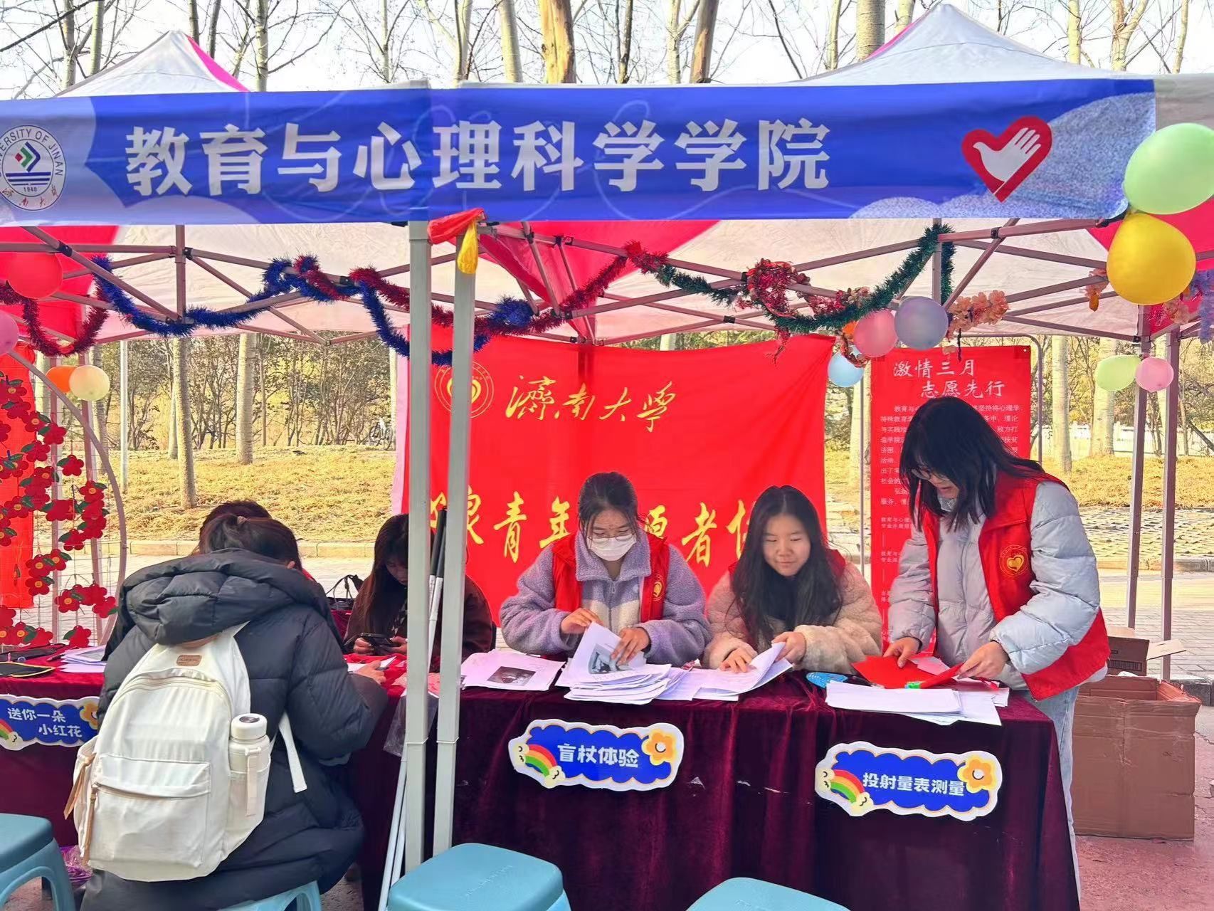在活动中,特殊教育和公共事业管理(教育管理方向)专业的党员和入党积极分子发挥专业技能优势,在现场开展盲杖体验、手语基础教学和心理投射量表测验等特色活动。各位志愿者向现场的体验者详细讲解盲杖的用法,辅助体验者利用盲杖探索行走;向参与者示范基本手语,了解参与者的兴趣现场教学;根据测试者心理投射量表结果,帮助测试者进行自我剖析。