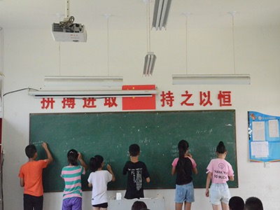 语言为民族之本,文字乃传承之魂。上午的课程,志愿者们首先开展的是一节语文课。课前,志愿者们积极备课,综合考虑学生的接受能力、理解能力、学习进度等多方面因素,经过反复商讨后确立最终教案。伴随上课铃响,志愿者准时进入教室,看着孩子们求知的眼神,主讲的志愿者背过身一笔一划在黑板上写出今天上课的内容:“同学们,大家把练习本拿出来,我们今天来学习新的知识……”在授课过程中,志愿者不间断地注意着孩子们的状态,不时和善地提醒同学们注意握笔姿势与眼笔距离。在下午的数学课上,为加深学生记忆,提升学生的课堂参与度,志愿者采取了课堂互动的教学方式:在基本授课结束后,主讲的志愿者在黑板上列出几道练习题,请同学们当场上台解答。在解题结束后,志愿者带学生们一起订正答案,并就解题过程中同学们常出现的问题进行告诫与讲解。课程最后,志愿者向学生们布置了适量课后作业,以巩固今日学习效果。
