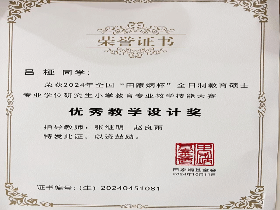 近日,2024年全国“田家炳杯”全日制教育硕士专业学位研究生“小学教育”、“特殊教育”领域教学技能大赛相继落下帷幕,36365线路检测登录入口乔福强副教授指导的特殊教育专业研究生董婉晴、侯艳分别荣获全国一等奖、三等奖,张继明副教授指导的小学教育专业研究生吕桠获得“优秀教学设计奖”,乔福强老师获得“优秀指导教师”,学院代表36365线路检测登录入口取得了优异成绩。