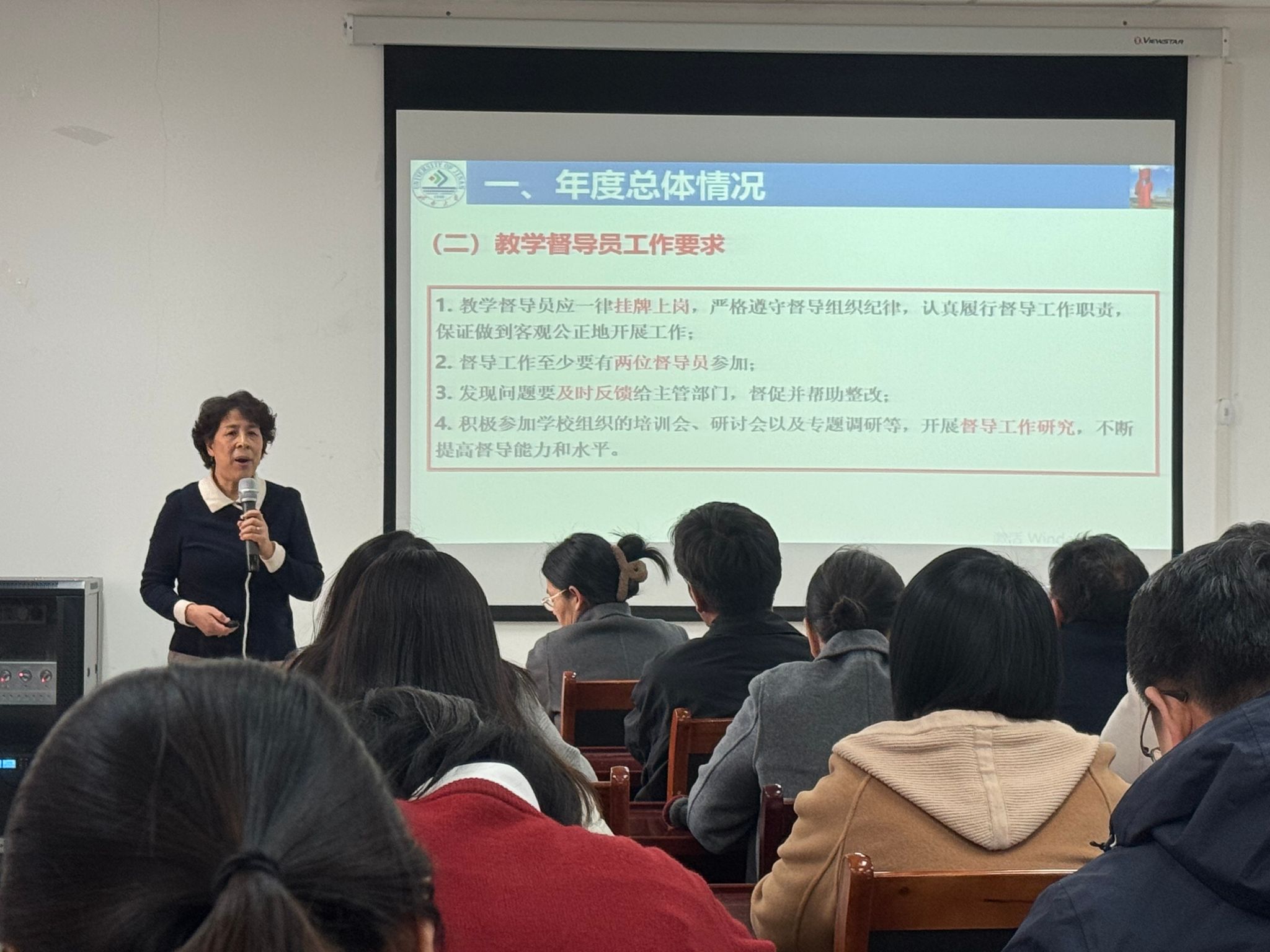 紧接着,王元秀教授代表学校教学督导组,对 2024 年度本科教学督导整体情况作专项反馈。王教授详细阐释了教学督导员的工作要求与内容,梳理了 2024 年度督导工作的各项情况。她明确指出,教学督导秉持 “以督促导、以导带督、督导结合、重在指导” 的原则,鼓励教师们主动加强与教学督导的沟通交流,充分借助督导力量提升自身教学水平。此外,王教授从督导视角出发,为学院本科教学管理工作提出了一系列极具价值的建设性意见。