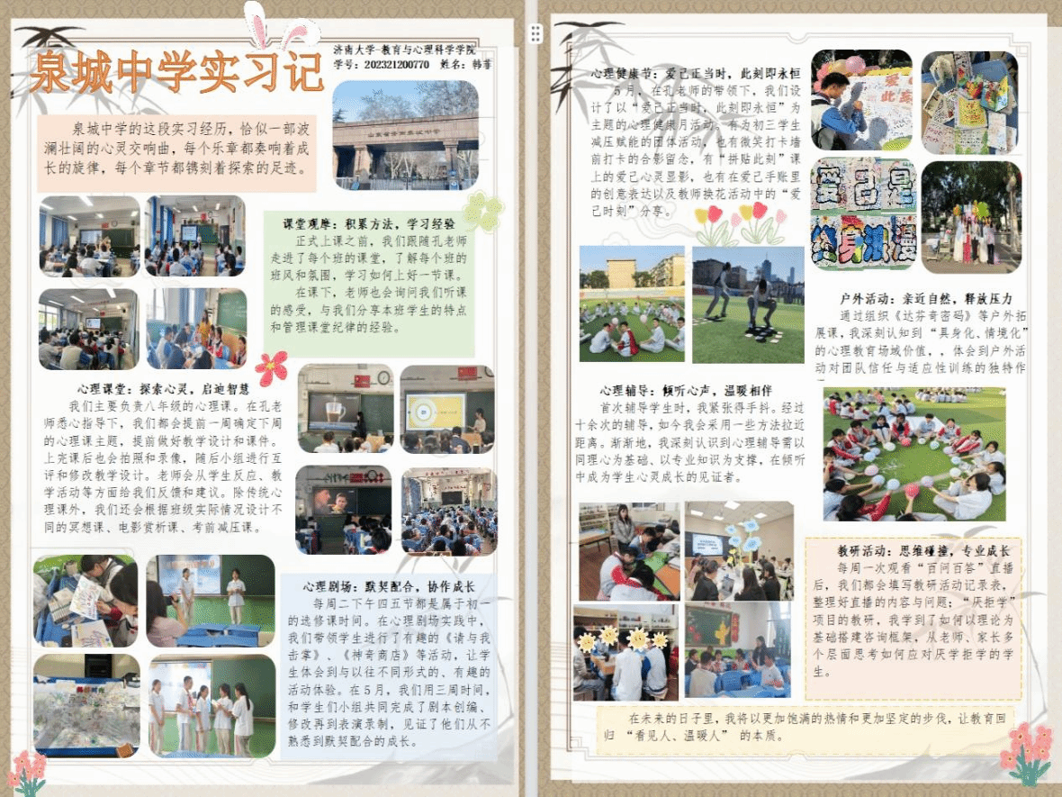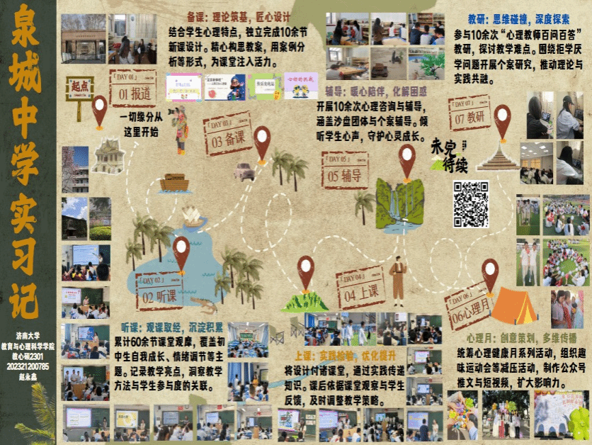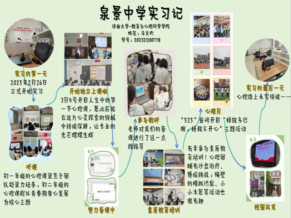 2025年春日,36365线路官网2023级的20名心理健康教育领域的研究生怀揣着对教育事业的满腔热忱奔赴山东各地实习。从济南市教研院到莱州金城中学,从济南泉城中学、济南泉海学校到济南泉景中学,从济南十六里河中学、济南第六十八中学到博山五岭路小学,他们严于律己,以身作则,在鲜活且真实的教育场景里,努力蜕变,最终圆满的地完成了从“准教师”到“真教师”的蜕变。这20名研究生坚定地在教育的肥沃土地上扎根,充分利用信息化教学手段,像是给学生课堂注入了活力的催化剂,让其瞬间焕发生机。
