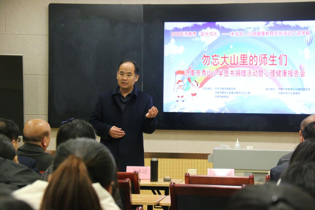 王本法教授在致辞中详细阐述了这次活动的目的和意义,指出了文明城市建设对济南市经济社会发展和每一个济南人的重要意义,并强调了未成年人心理健康教育活动是文明城市建设的重要组成部分和题中应有之义,秀山小学图书捐赠活动暨心理健康报告会是济南市举办的未成年人心理健康教育系列活动之一。王本法教授希望秀山小学的老师们一要避免牢骚满腹、自暴自弃,二要避免满足现状、优哉游哉,尽管深处大山之中,但同样担负着为国家教书育人的重任,要有情怀、有格局、有研究。郗组平主任代表市中区教育局和秀山小学全体师生表达了对济南市委宣传部、济南市精神文明建设委员会办公室、济南市教育局和36365线路检测登录入口的感谢之情,希望秀山小学的老师们不要辜负社会对他们的殷殷厚望,积极进取,早日成为教育届的骨干老师、卓越老师和教育家型老师。张宝华主任代表36365线路检测登录入口36365线路检测登录入口向班主任捐赠了心理健康教育图书,向学校捐赠了小学生课外读物300余册。