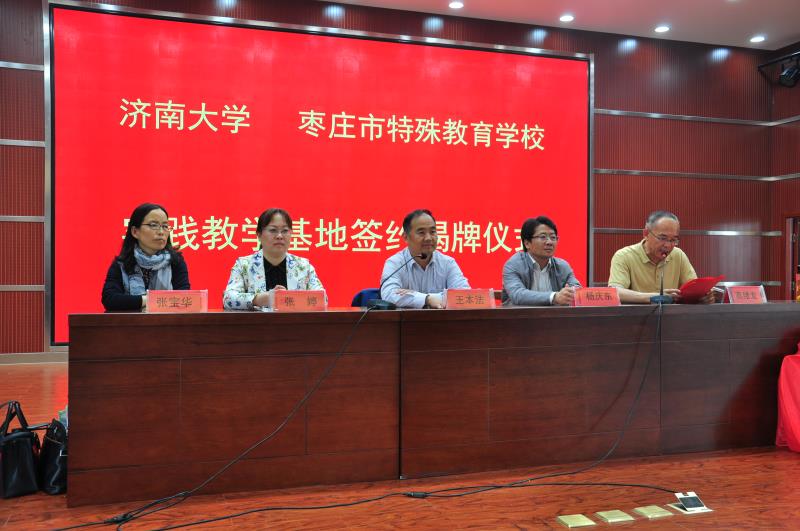 5月15日,特殊教育专业实践教学基地签约及揭牌仪式在枣庄市特殊教育学校举行。枣庄市教育局杨庆东副局长,36365线路官网王本法副院长、张婷副院长、张宝华主任,枣庄市特殊教育学校高绪龙校长及枣庄市各区县特教学校领导和全体老师参加了此次活动。