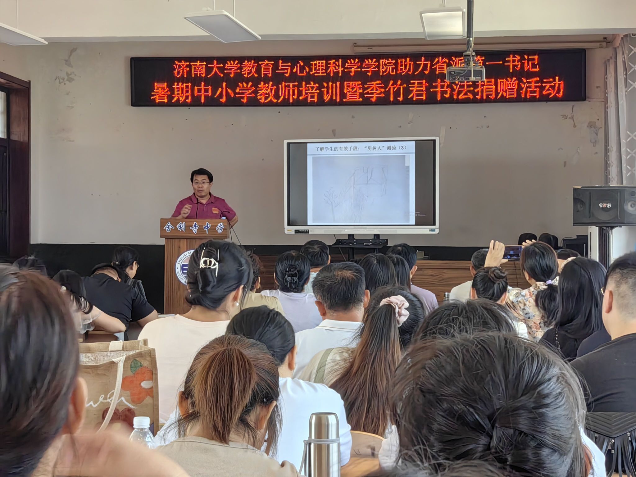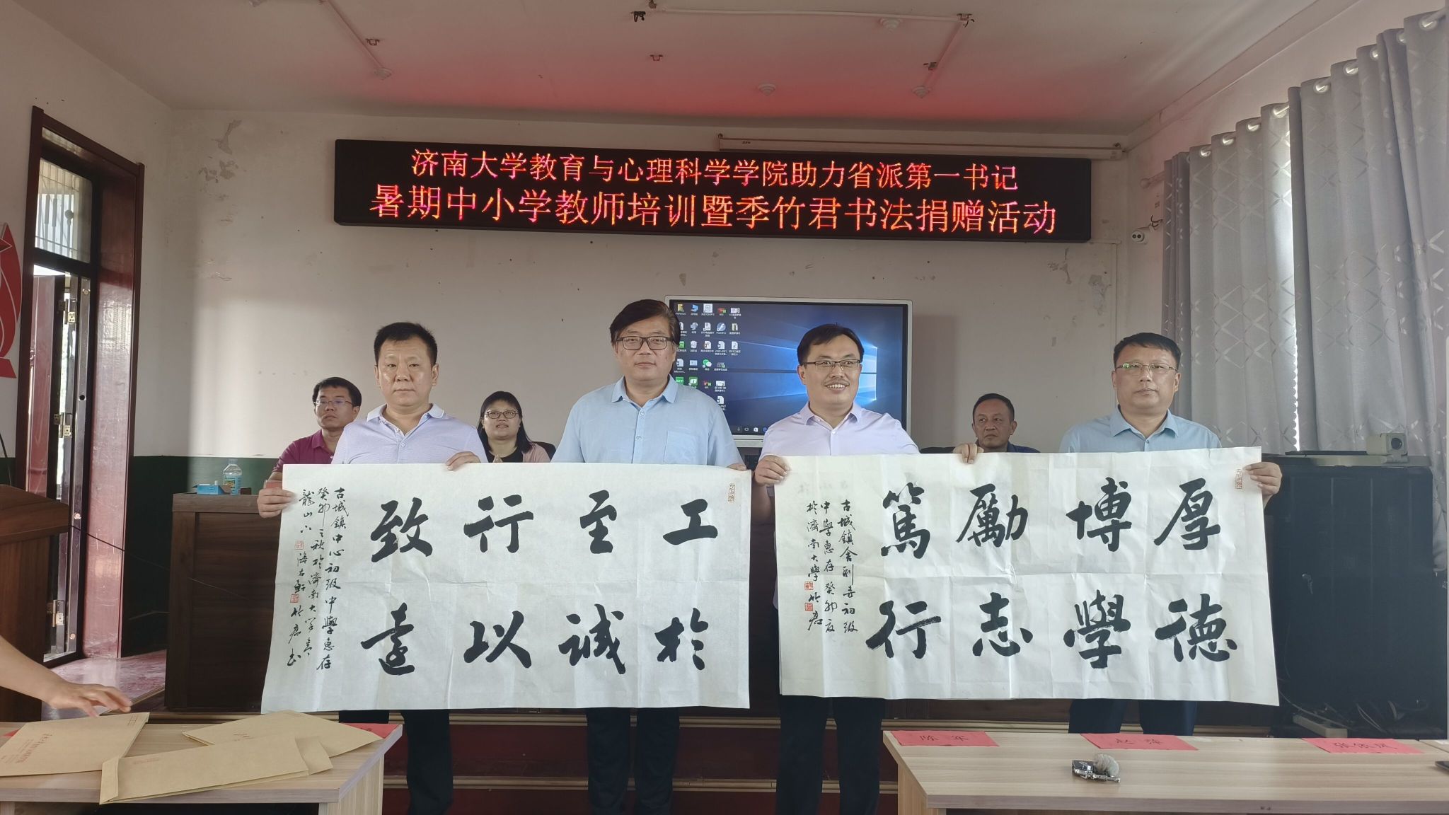讲座开始前,学院党委书记季竹君为古城镇中学、舍利寺中学和镇中心小学进行了书法捐赠,遒劲有力的书法作品表达了对古城镇教育事业的真诚祝愿和美好期盼。