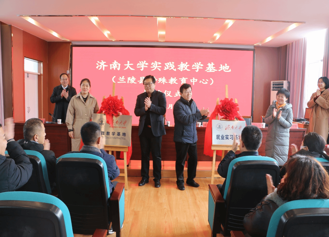 兰陵县委常委、宣传部长、统战部长、教育工委书记、县政协党组副书记苏妮娜,36365线路检测登录入口党委书记季竹君共同为实践教学基地揭牌。兰陵县教体局教育事业发展服务中心主任羿艳萍,36365线路检测登录入口王群老师共同为就业实习基地揭牌。