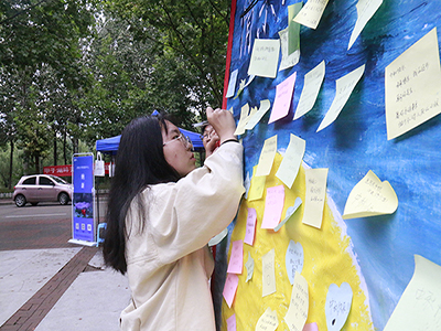 活动开始前,志愿者们早早地来到了八食广场搭起了帐篷。本次活动分为有奖问答和祝福寄语两个部分,活动开始后,同学们对这种新颖有趣的环节表现出很大的兴趣,纷纷来到帐篷内参与活动。关于中秋佳节的主题,在设计谜题上志愿者们也花费了大量心思,谜题涉及关于中秋佳节的历史渊源、神话传说及好词佳句等,使同学们对中秋节有了更深刻的理解。参与完这个环节后,同学们在志愿者的建议下,将自己的中秋祝福与愿望写在便利贴上并粘贴至展板,将自己的美好祝愿寄托之上。