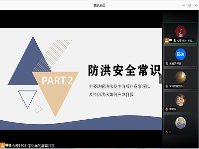 在宣讲会上,主持人首先进行了抗洪救灾知识的介绍,为同学们介绍了抗洪救灾中常用方法,并强调了抗洪工作中做好洪涝开始前监测工作的重要性;随后主持人通过介绍抗洪救灾中一线人员的优秀事迹对抗洪救灾精神做出总结并鼓励同学们学习、发扬抗洪救灾精神,在日常生活中积极地参与到抗洪救灾工作之中;紧接着,举办此次活动的志愿者们在群里积极解答同学们提出的相关问题,并且调动大家积极参与抗洪工作的积极性;最后,主持人做总结发言,会议圆满结束。