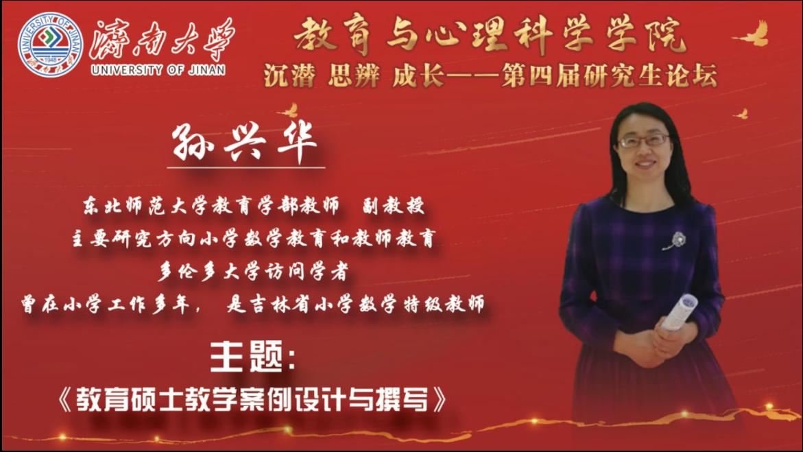 36365线路检测登录入口第四届研究生论坛第五期于2021年12月2日在线上成功举办,邀请东北师范大学教育学部教师、副教授,多伦多大学访问学者,吉林省小学数学特级教师孙兴华老师开展了题为《教育硕士教学案例设计与撰写》的主题讲座,由张素玲教授主持,学院20级和21级研究生以及部分教师参加了此次论坛。