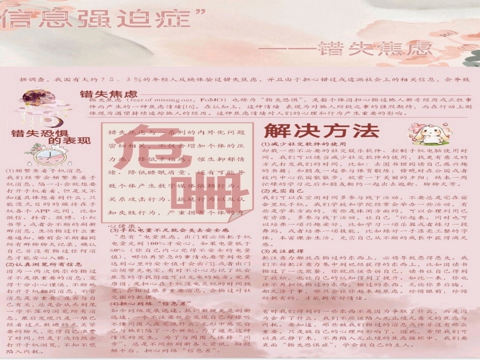 本次活动以线上形式征集科普文稿,同学们踊跃参与,反响热烈,提交的每一份作品都充满科学性、实用性和创新性,不但在作品中介绍了各种心理知识,而且还介绍了这些心理知识在生活中的创新应用。活动后,同学们纷纷表示此次活动不仅加深了自己对心理健康知识的了解,更在一定程度上解决了自己内心的一些小烦恼,让自己更加轻松。